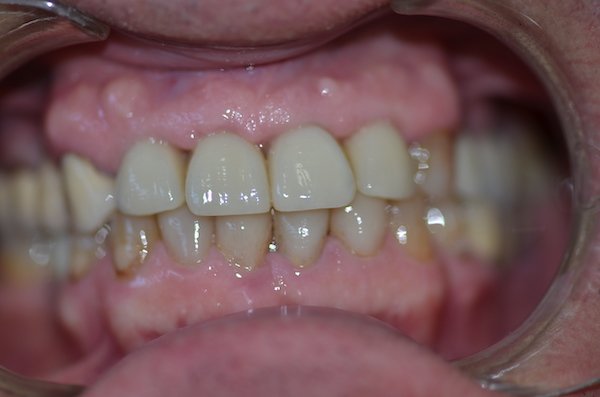 (After) – Upper incisors replaced with dental implants, restored lower incisors